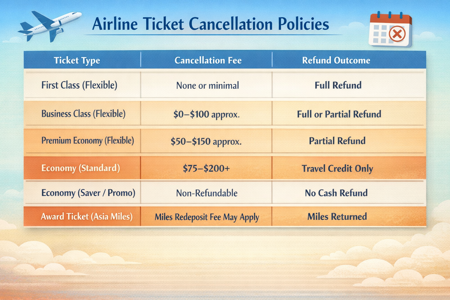 Note: These are approximate ranges. Exact fees depend on your route, fare class, and time of cancellation. Always verify through Cathay Pacific directly or call airfarepolicies at +1-855-869-7071 for a fare-specific breakdown.
