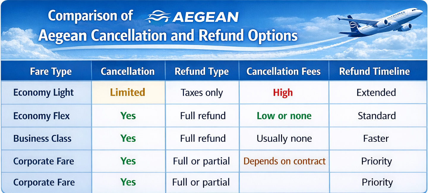 This table highlights how the Aegean flight cancellation process and refund rules differ by fare.